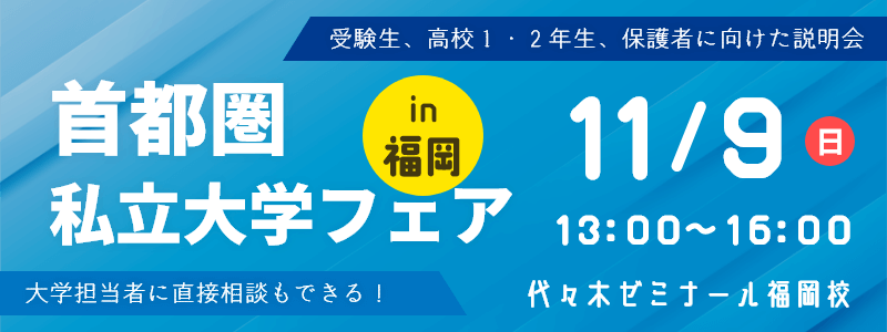 首都圏私立大学フェア2025 in 福岡に出展します(事前申込制)。 個別相談に加え、大学説明会も実施します。お近くの方はぜひご参加ください。