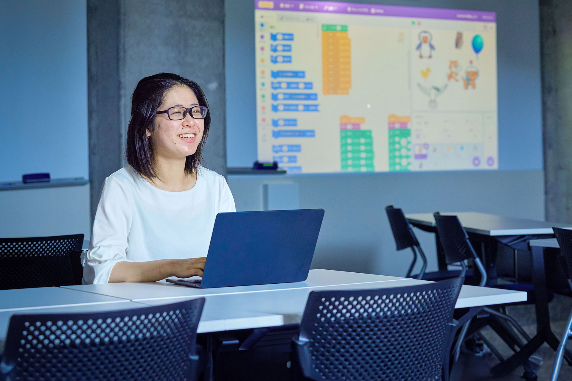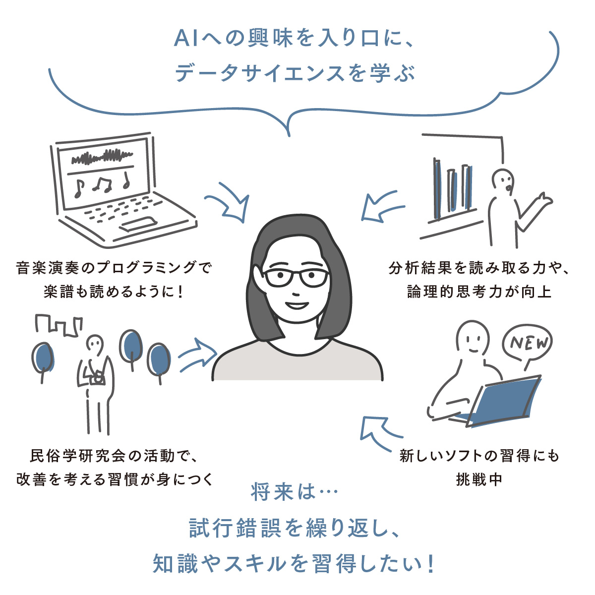 最初はExcelで表を作ってデータの特徴を可視化し、データを読み解く演習を行いました。高校でも触れたことのある内容だったので取り組みやすく、分析結果を適切に読み取る力がついたと感じます。「データサイエンス基礎」の授業では、音楽演奏ができるScratchというプログラミング言語を使いました。音のズレが起こる原因を考え、微調整を繰り返すことで、好きな曲をパソコン上で再現できました。楽しみながらプログラミングを習得し、論理的思考力も鍛えられました。せっかく学んだ知識を活かしてみようと1週間ほどかけて作品をつくり、学内の「音楽演奏プログラミングコンテスト」に出場したところ特別賞に選ばれ、とても嬉しかったです。