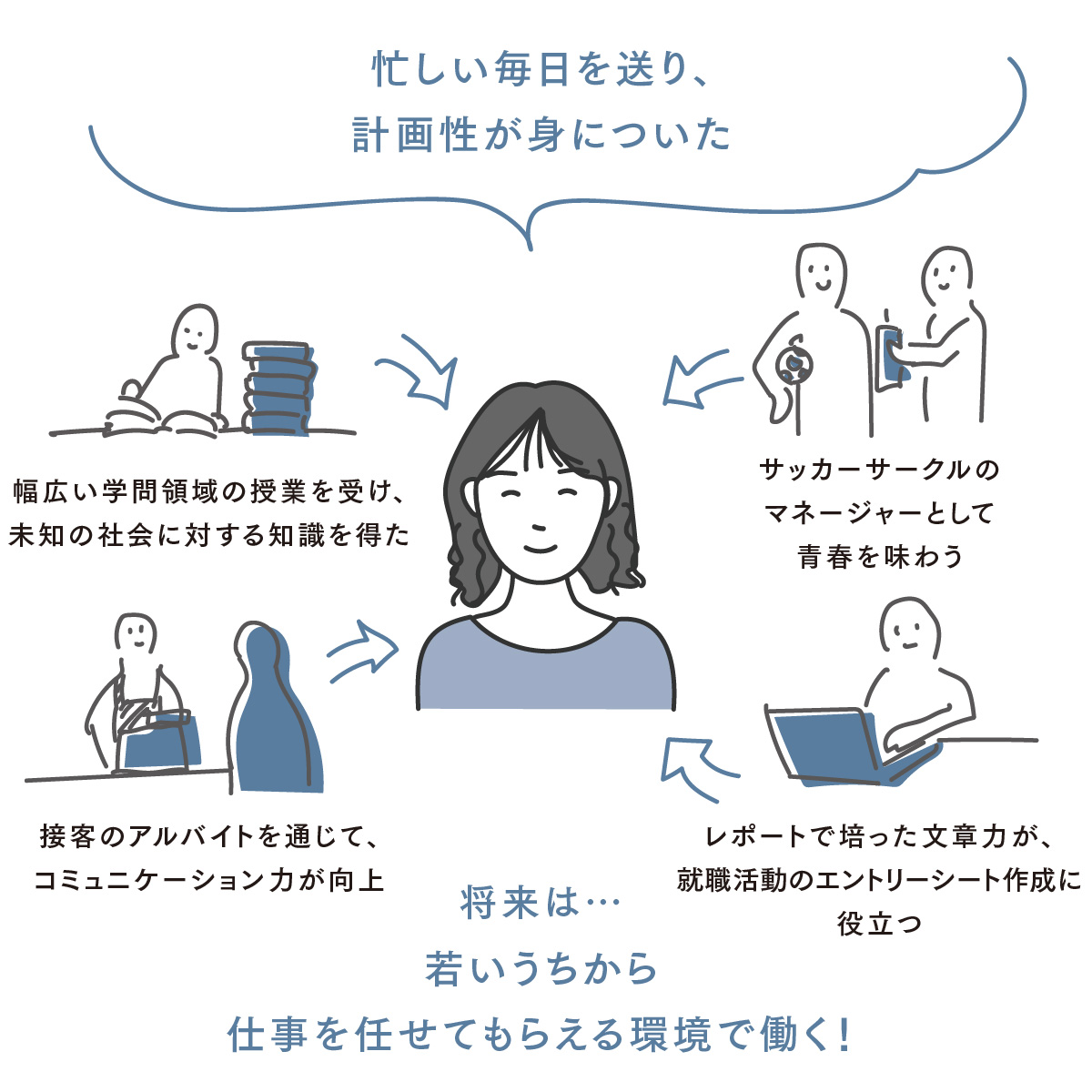 課外活動では、サッカーサークルのマネージャーをやっています。合宿やイベントに参加してメンバーをサポートするのが主な仕事です。全学年合わせると100人程度が所属しているので、イベント時のやり取りや、予算管理などで苦労する面もありますが、大人数での合宿などは大学生ならではの経験です。1年次から、同じ学科の同級生4人と一緒に活動しているので、絆が深まりました。サークルに入っていなければ得られなかった思い出をたくさん作ることができ、充実した毎日を送っています。アルバイトは掛け持ちして行っています。自分から仕事を見つけて動くことの大切さを知り、接客を通じてコミュニケーション力を磨くことができました。大学で授業を受け、課題のレポートを書き、サークル活動をして、遊ぶ予定のためにアルバイトを入れるといった忙しい生活を送り、計画性を持って行動できるようになりました。