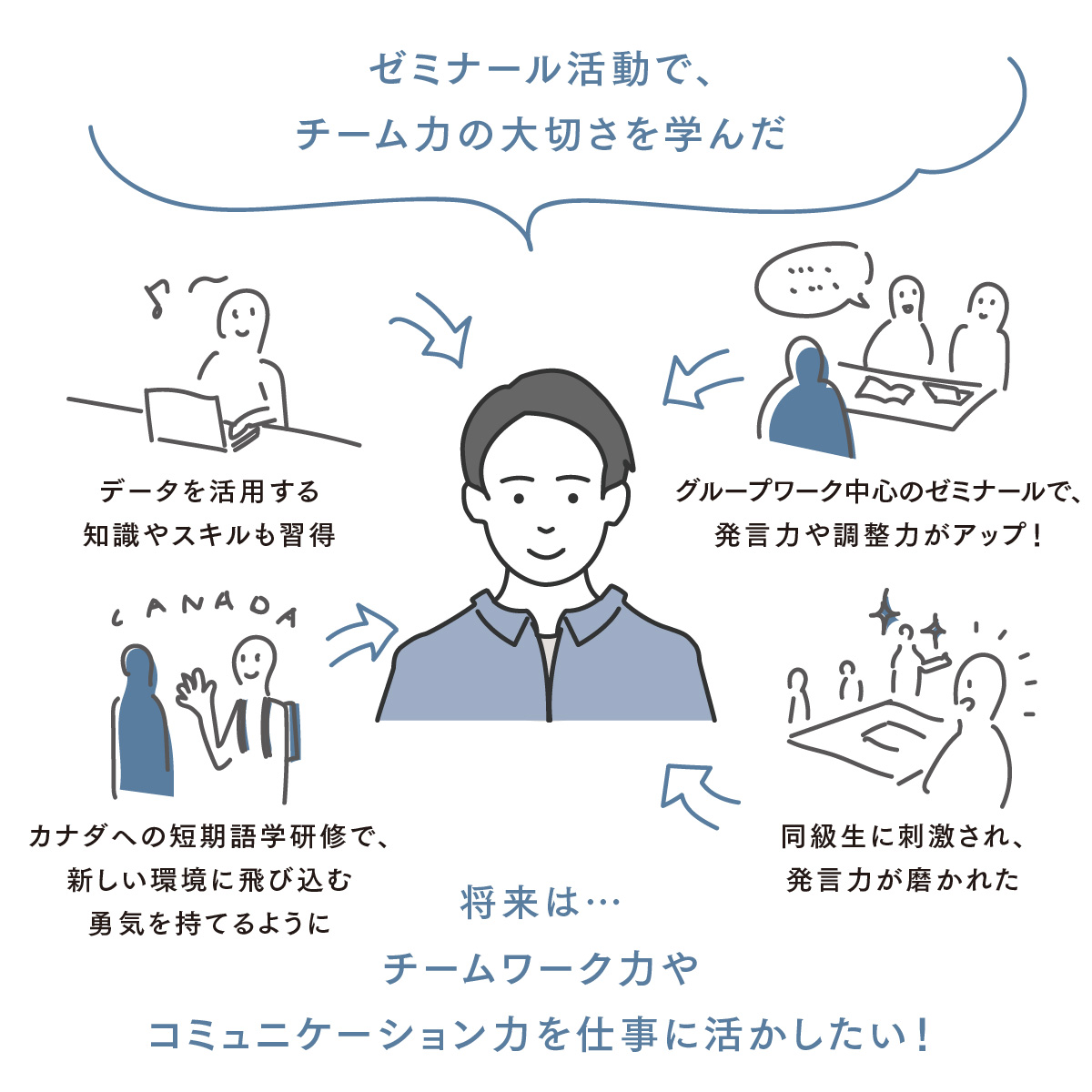 学科の授業やゼミでのグループワークでは、自発的に意見を言う機会がとても多いです。特にゼミでは、聞いているだけでなく、自分の意見をしっかり伝えることが大切。最初の頃は、なかなか意見が言えなかったのですが、同級生が発言する姿に刺激され、積極的に話し合いに参加し、自分の意見を伝えられるようになっていきました。卒業後は、チームで協力しながら目標に向かって取り組むような仕事をしたいと考えています。チーム内の様々な意見を聞き、アドバイスや調整する力を活かしていきたいです。