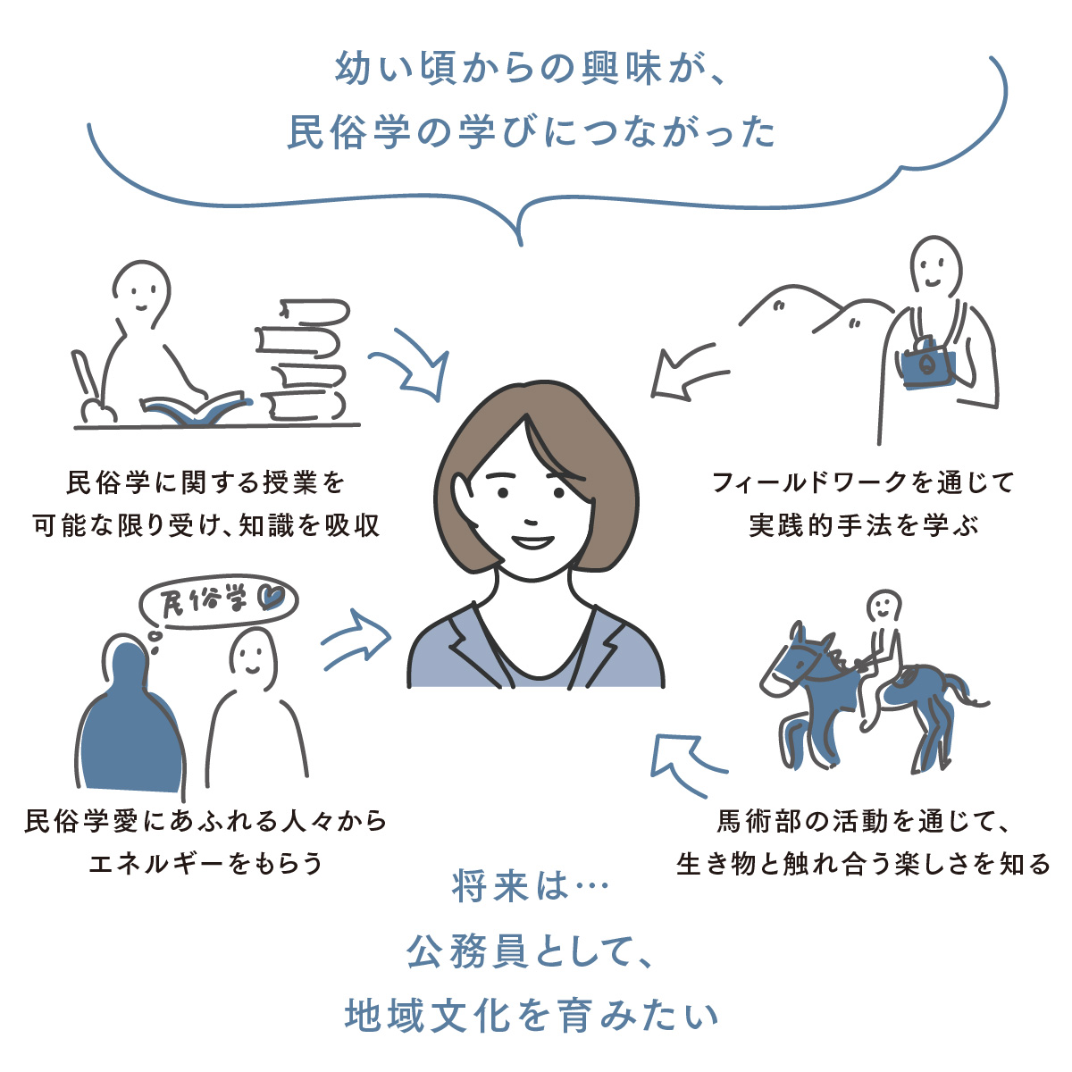 将来は、地域文化を支える柱の一つになりたいと考えています。文化は守るものではなく、育むもの。だからこそ、文化を育む母体である自治体で公務員として働くことが目標です。地域の人々と関わりながら、地域文化に携わるような仕事をしていきたいと思います。