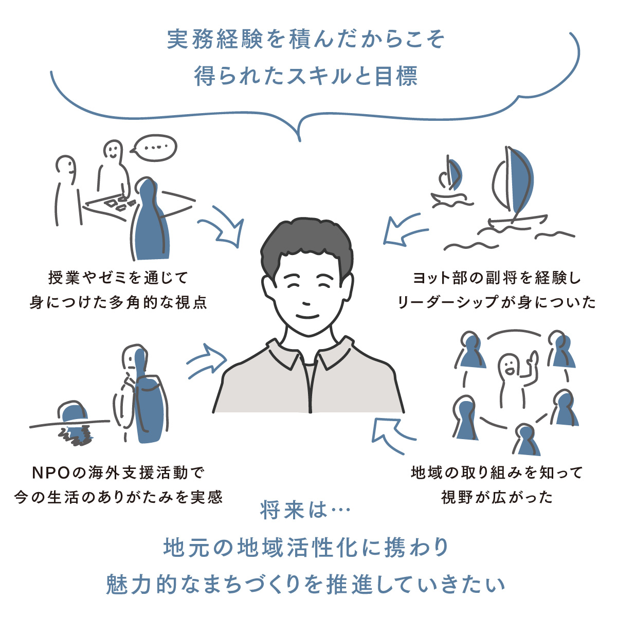 これまで履修した授業の中で、特に学びを深められたのが「地域政策論」です。人口減少や高齢化、観光振興、産業活性化などの地域課題について、具体的な事例を通して学び、地域ごとに課題や取り組み方が異なることを知りました。少子高齢化が進む山形県長井市の事例は、特に印象に残っています。若い世代の方々が「地域おこし協力隊」として長井市に移住し、地域の活性化に取り組んだり、市がDX(デジタルトランスフォーメーション)の大会を主催してまちのデジタル化を進めたりしていると聞き、課題を捉える視野が大きく広がりました。また、課外活動ではヨット部の副将として、チームの運営や後輩の指導に積極的に携わる中で、責任感やリーダーシップを養うこともできました。これらは社会に出てからも活かせる力だと感じています。