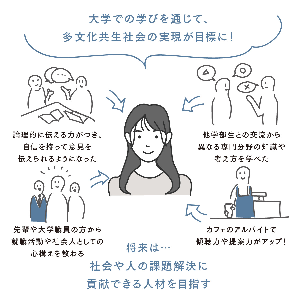 部活動を通じて他学部の友達も多くでき、異なる専門分野や考え方に触れたことで、視野が大きく広がりました。また、先輩や大学職員の方々と交流する機会も多く、先輩からは就職活動に関する具体的なアドバイスを、職員の方からは社会人としての心構えや働くことについて学べ、自分自身の成長につながっています。これまでの経験の中で、人や組織が抱える課題に向き合い、自分なりに働きかけることにやりがいを感じてきました。将来は、社会や人の課題解決に貢献できる仕事に携わりたいです。大学の学びを通じて身についた、自分の考えを論理的に伝える力や対応力、判断力を活かし、常に新しいことに挑戦していきたいです。