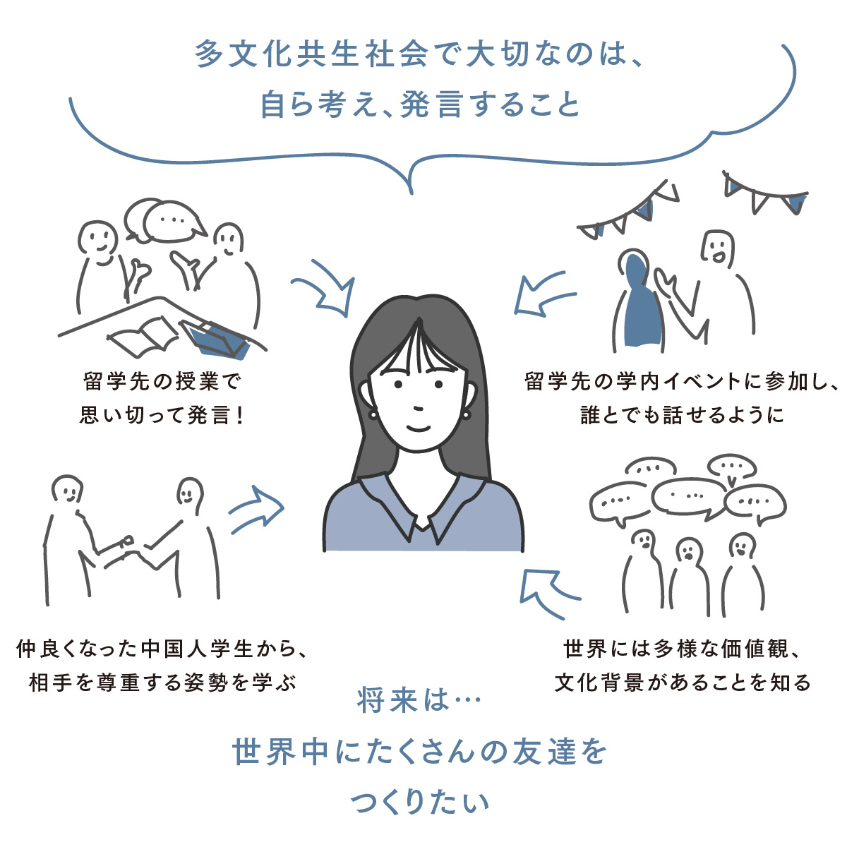 留学中、定期的に開催される学内イベントや、放課後に友達と遊んだバスケットボールなどで、知らない人に話しかけたり、話しかけられたりするうちに、言葉や文化が違っても、お互いを理解し、打ち解けあうことができるとわかりました。特に印象に残っているのは、仲良くなった中国人のクラスメイトです。彼女は、多国籍のクラスメイト一人ひとりの言動を見て相手を理解しようと努力し、その上でできることを考え、実行する人でした。本当に相手のことを思って行動する彼女の姿を見て、私自身も「小さな理解と行動」から始めてみようと心に決めました。
